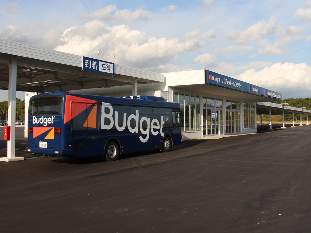 (建物外仮設通路は送迎バス発着場横を通りますが、直接バスをお待ち頂くことはできませんので、必ずバジェットレンタカー受付カウンターまでお越しください)